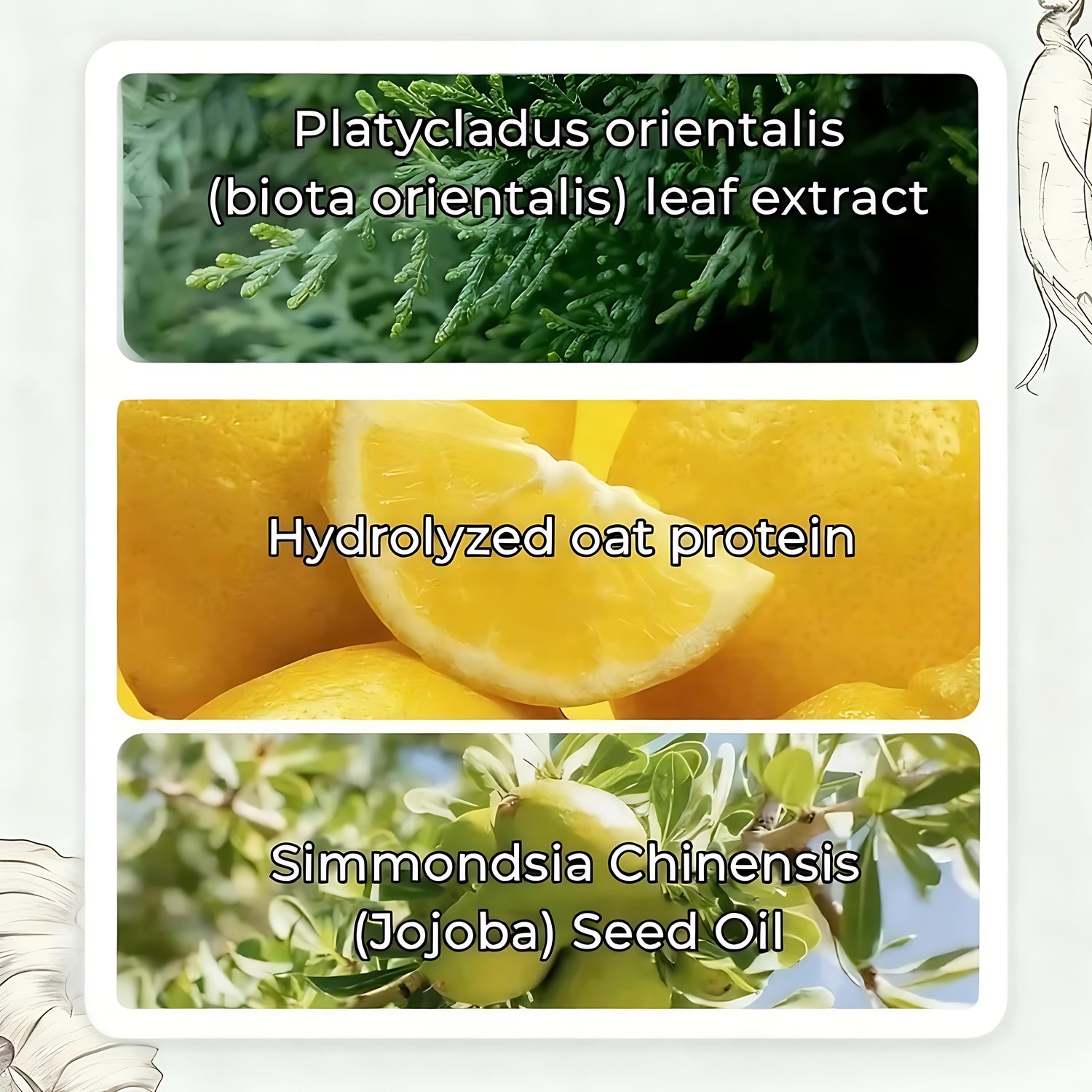 Stress, pollution, and time weaken hair day after day. But with Anti-Hair Fall Shampoo, every wash becomes a ritual of renewal. The natural blend of biota orientalis, jojoba, ginseng, and oats repairs damage and stimulates growth, giving your scalp the care it craves. Slowly but surely, your hair regains shine, volume, and resilience – transforming daily care into visible revival.